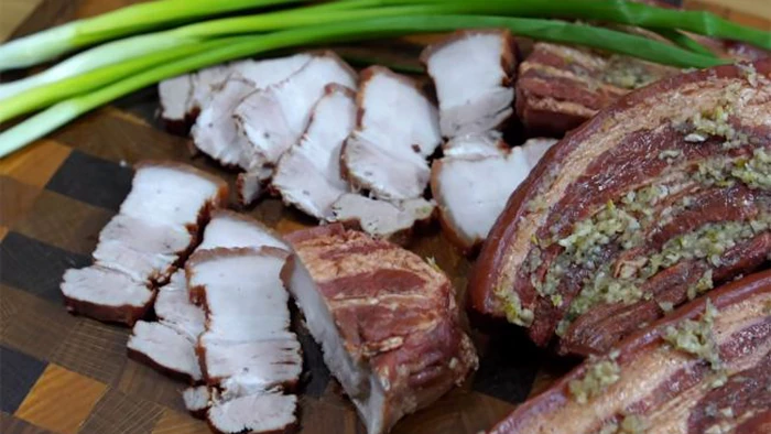 - Wyjąć słoninę, osuszyć i obficie natrzeć czosnkiem i przyprawami.